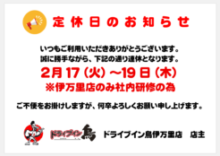 平素よりお世話になっております。 誠に勝手ながら上記の期間、社内研修(伊万里店のみ)の為休業とさせいただきます。 2月20日(金)より通常営業致します。 皆様にはご不便をおかけいたしますが、何卒ご理解のほどよろしくお願い・・・