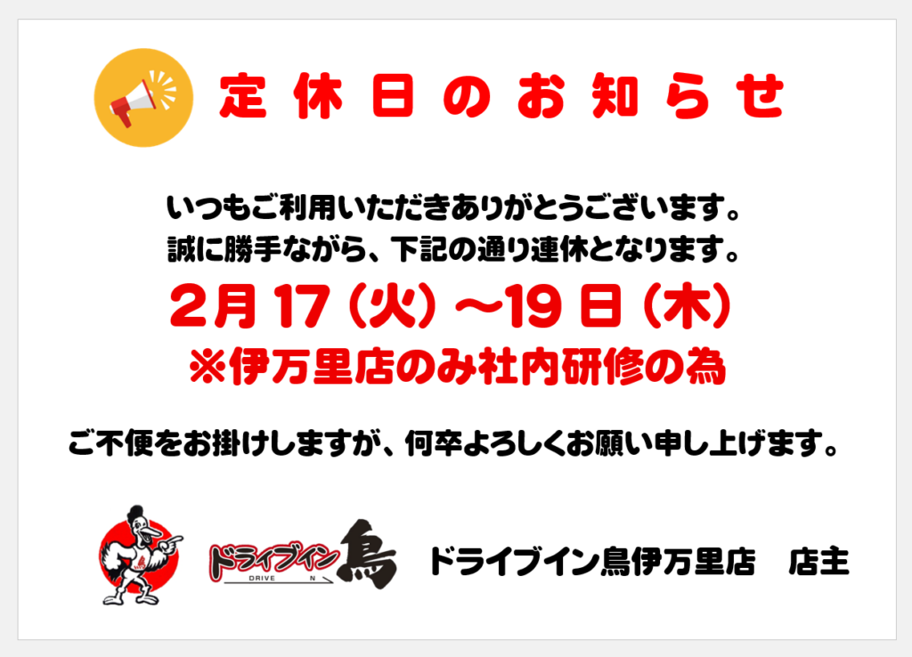 誠に勝手ながら上記の期間、社内研修(伊万里店のみ)の為休業とさせいただきます。