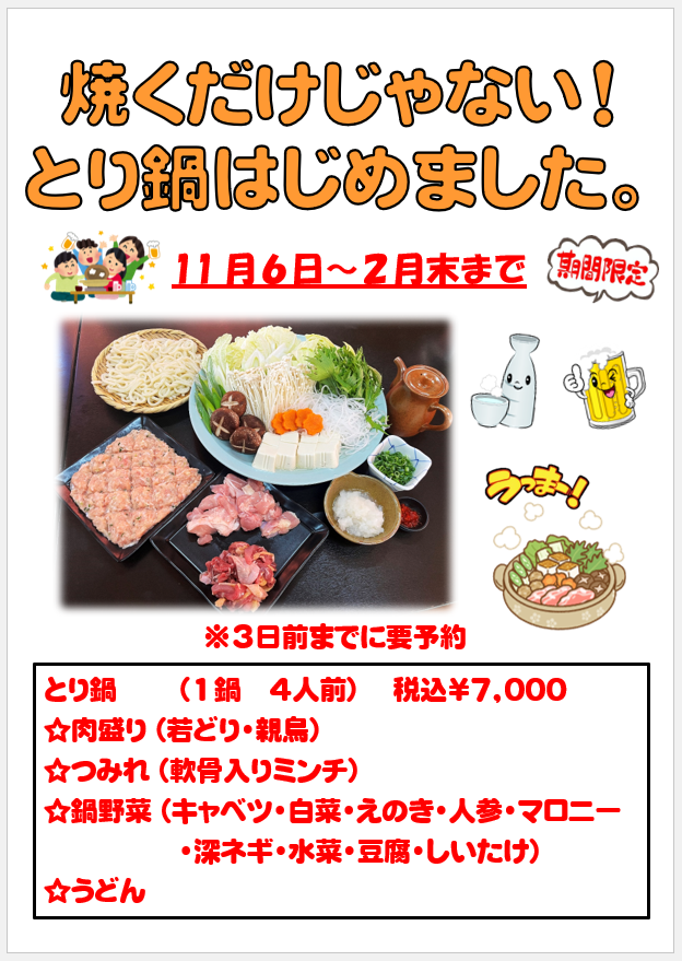 冬と言えば鍋です!ドライブイン鳥は焼鳥だけではありません!