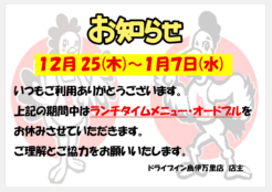 いつもご利用いただきありがとうございます。 ドライブイン鳥ポイントカードが12月末で終了となります。 現在お持ちのポイントも12月末で期限切れとなります。 1月からは使用出来なくなりますので、お早目のご利用をおススメしま・・・