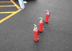 夜の部という事で、暗くなる18時から避難訓練を行いました。 まずは消火器を使ってやっていきます。 その前に西部消防の方に来ていただき、 取扱いの説明をしていただきました。 消火器を使った事ない方を中心に、交代で実際やって・・・