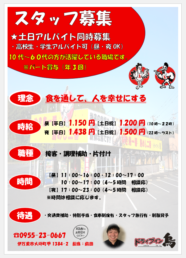 ドライブイン鳥伊万里店では一緒に働いてくれる方を募集しています♪